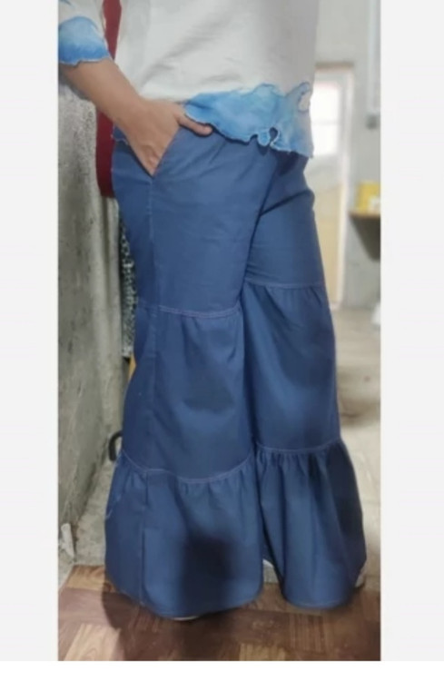 این مدل شلوار برشدار هست و در هر برش چین داره بسیار تن خور راحتی داره جنسش لی کاغذی هست و قد 100تا 105داره دم پای پایین شلوار 70سانتی متر است