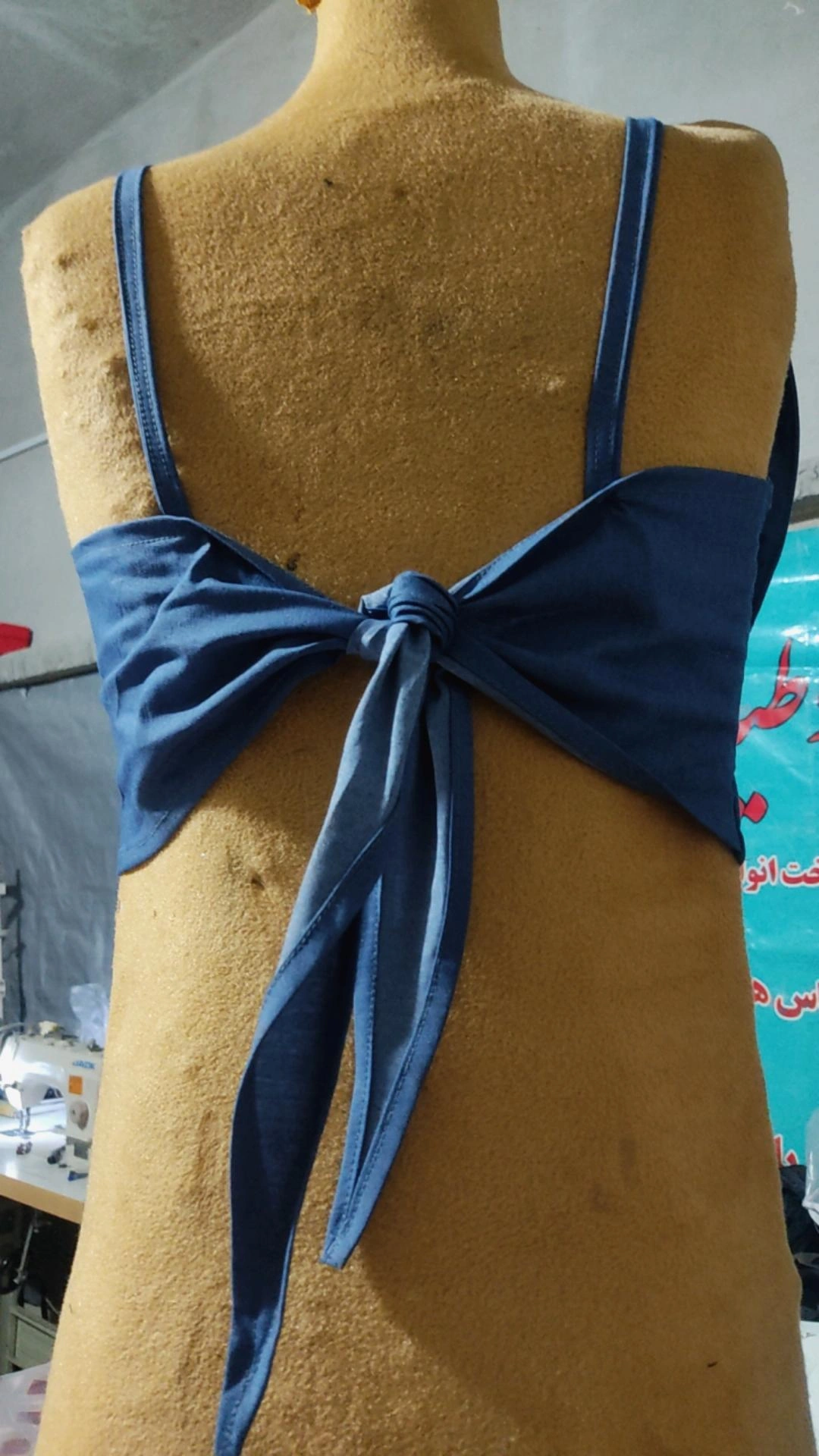 قد کراپ تاپ 35 سانت هست جنس لی کاغذی داره از پشت گره میخوره و تغییر سایزش براحتی انجام میشه قسمت جلو دو لایه هست از سایز 36تا460مناسبه
